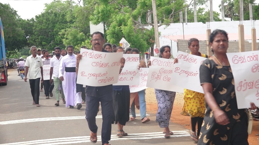 மாந்தை மேற்கு வெகுஜன அமைப்புக்களின் ஒன்றியத்தின் ஏற்பாட்டில் நேற்றுக் காலை 10.00 மணியளவில் அடம்பன் சந்தியில் இருந்து ஆரம்பமாகிய இந்தப் பேரணி, மாந்தை திருக்கேதீஸ்வரம் மனிதப் புதைகுழி கண்டுபிடிக்கப்பட்ட இடம் வரை, முன்னெடுக்கப்பட்டது.