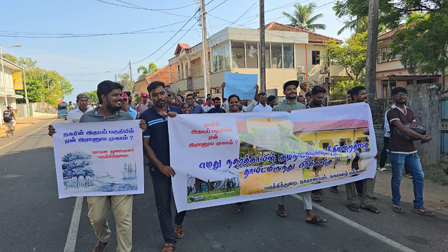 பருத்தித்துறை நகரை மீட்போம் எனும் தொனிப்பொருளில் இன்று காலை 8.30 மணியளவில், பருத்தித்துறை இறங்குதுறைப் பகுதியில் இருந்து ஆரம்பமான பேரணி, வடமராட்சி வடக்கு பிரதேச செயலகம் வரை சென்று முன்னெடுக்கப்பட்டது.