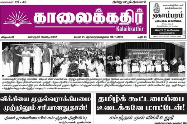 யாழ்ப்பாணத்தில் இருந்து காலைக்கதிர் என்ற புதிய நாளிதழ் இன்று முதல் வெளிவர ஆரம்பித்துள்ளது. மூத்த ஊடகவியலாளர் கானமயில்நாதனை பிரதம ஆசிரியராகக் கொண்டு, மற்றொரு மூத்த ஊடகவியலாளர் வித்தியாதரன் இந்த நாளிதழை வெளியிடுகிறார்.
